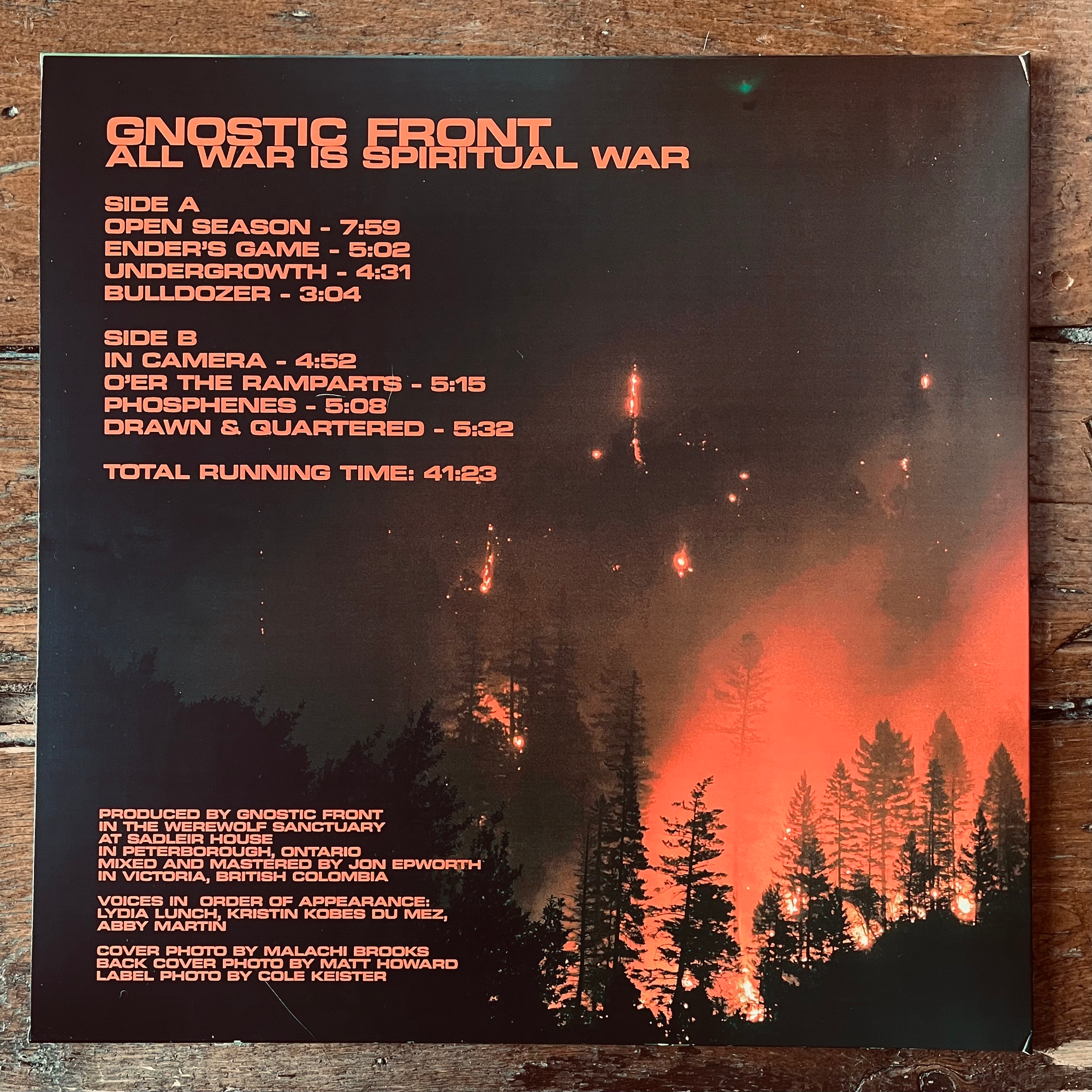 ALL WAR IS SPIRITUAL WAR presents eight tracks of analog electronics, in both danceable and undanceable forms. GNOSTIC FRONT is the alter ego of an alter ego, and this is the debut offering: an opening salvo; the striking of a bell; a first punch thrown.