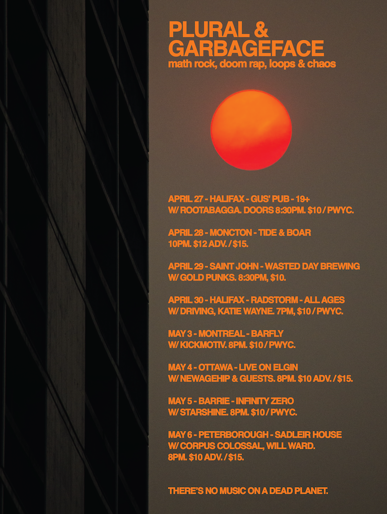 it's been a while since i've beaten this path with wheels and feet and words and beats and i'm really looking forward to it. i'll be joined by the homies PLURAL, who i used to play with regularly out in the eastern reaches back in the day. they are a most excellent math rock / loop duo that does some magical things with polyrhythms, and i'm all about that shit. they'll be accompanying me back to Quebec and Ontario, where they have never played before. i'm stoked to show them around a bit and help with their toe dipping.